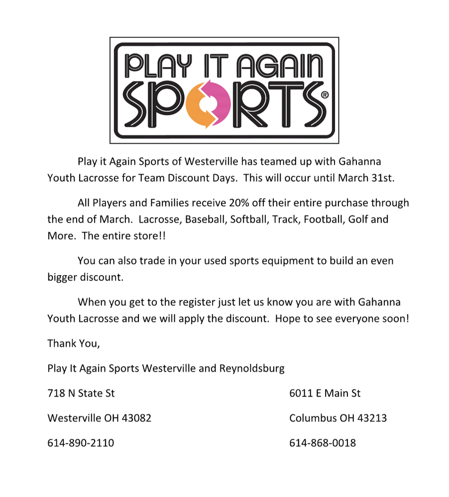 Mention you are a Gahanna Youth Player at Westerville and Reynoldsburg Play It Again Sports and get 20% Off.